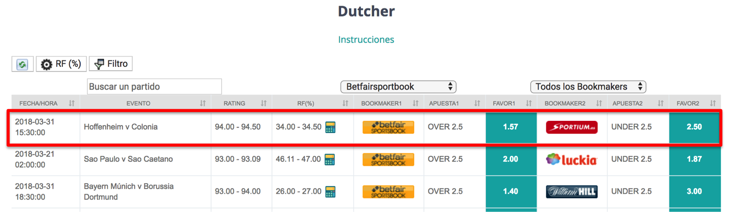 En pocas palabras, el Dutcher es simplemente el Oddsmatcher de los FAVOR+FAVOR y la única diferencia es que tendrás que cubrirte apostando en resultados opuestos (mientras con el favor+contra “apuestas” en el mismo resultado).